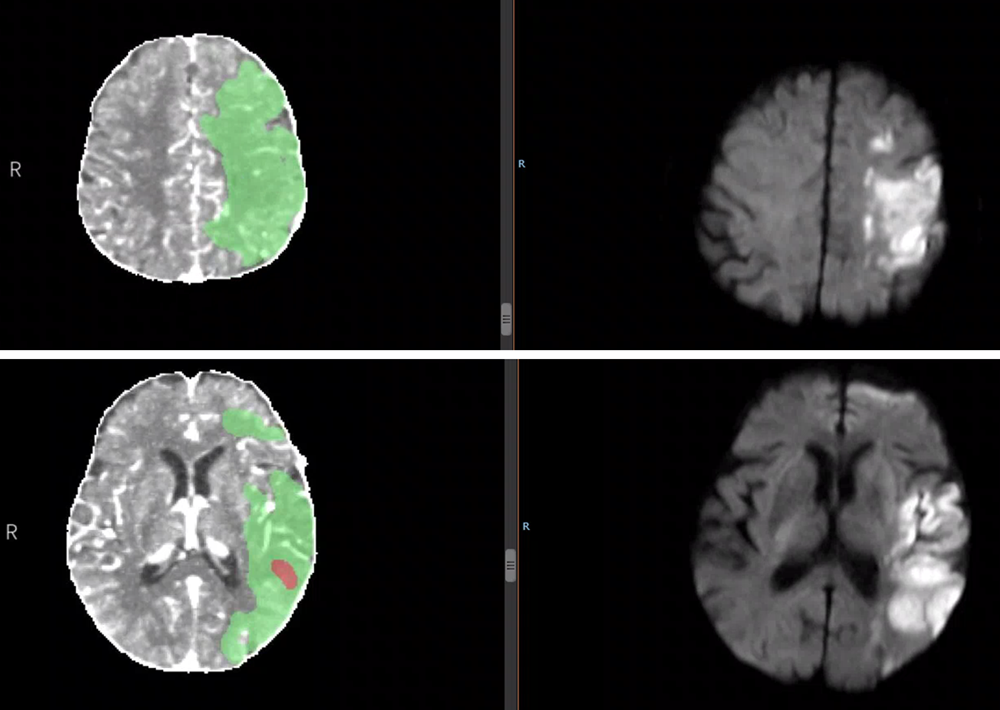 左侧:溶栓前CTP灌注成像显示梗死核心(红色)与缺血半暗带(绿色)