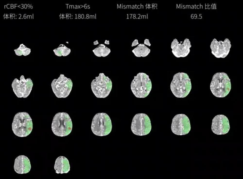 CTP灌注成像:红色区域梗死核心,绿色区域为缺血半暗带