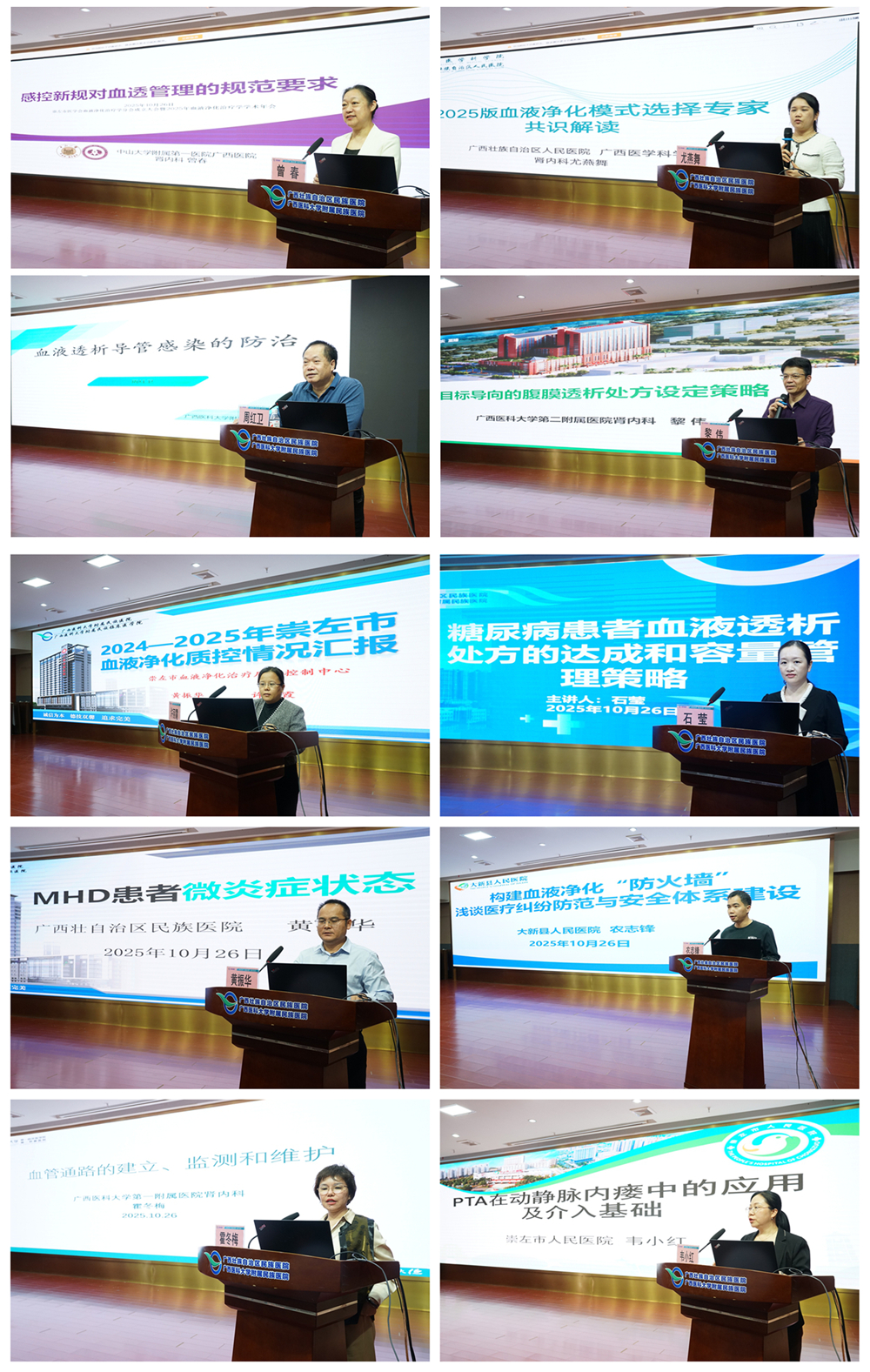 中山大学附属第一医院广西医院的曾春教授以《感控新规对血透管理的规范要求》为主题,系统解读《WS/T854-2025血液透析部门(中心)医院感染预防与控制标准》;广西壮族自治区人民医院尤燕舞教授开展《2025年血液净化模式选择专家共识解读》专题授课;广西医科大学附属肿瘤医院周红卫教授围绕血液透析导管相关感染防控展开讲解;广西医科大学第二附属医院黎伟教授以《目标导向的腹膜透析处方设定策略》为核心内容授课;崇左市人民医院韦小红教授聚焦《PTA在动静脉内瘘中的应用及介入基础》;广西民族医院许丽霞副主任医师在质控会议环节汇报《2025年崇左市血液净化质控情况》;广西民族医院石莹主管护师分享《糖尿病患者血液透析处方达成及容量管理策略》;广西民族医院黄振华主任医师以《MHD患者微炎症状态诊治》为主题授课;大新县人民医院农志锋教授开展《构建血液净化“防火墙”——浅谈医疗纠纷防范与安全体系建设》专题分享;最后,广西医科大学第一附属医院霍冬梅教授针对《动静脉内瘘的构建、监测及维护》,深度浅出地从构建、监测、维护三方面进行系统阐述。