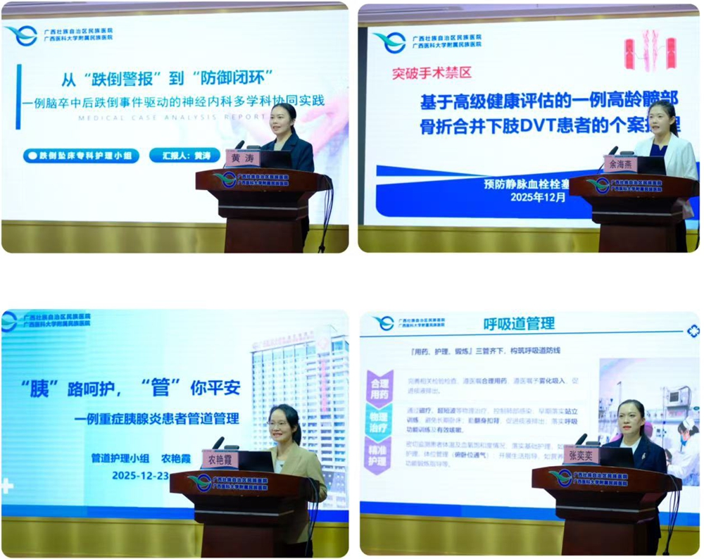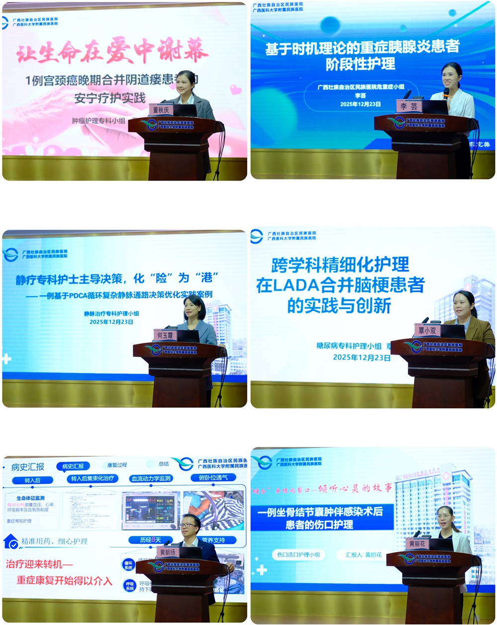 全院共10个护理专科小组参加比赛。各小组立足真实、典型的临床案例,以数据为支撑,以细节为见证,通过图文并茂的课件,系统呈现了从精准评估、难点剖析、循证干预、多学科协作到科学评价的全流程实践。案例内容广泛涵盖危重症护理、康复指导、静脉治疗、伤口造口、安宁疗护等多个专科领域,生动展现了护理人员在破解临床难题、改善患者结局、提升服务品质中的关键作用与专业智慧。