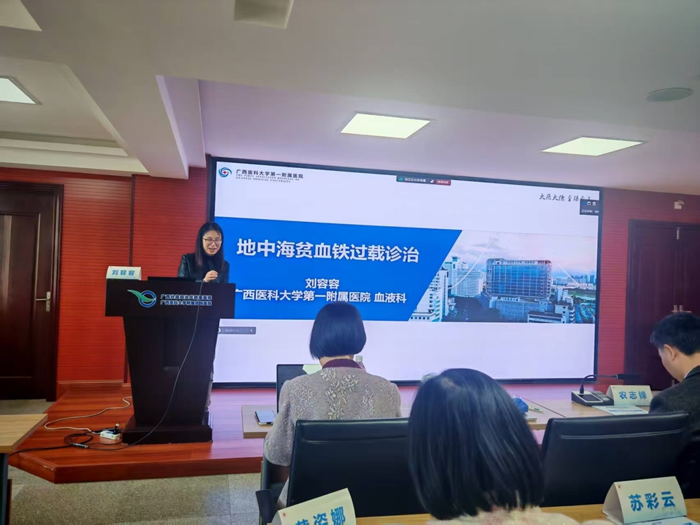 “地中海贫血的去铁治疗”专题由崇左市人民医院胡秀娟教授主持,广西医科大学第一附属医院刘容容教授担任讲者。刘容容教授精准解读了去铁治疗的适应症、个体化用药方案及疗效监测关键指标,为临床医生优化治疗方案提供了详实指导。讨论环节中,宁明县人民医院王伟林教授、大新县人民医院许文飞教授、龙州县人民医院龚金营教授围绕临床用药细节展开深入交流。