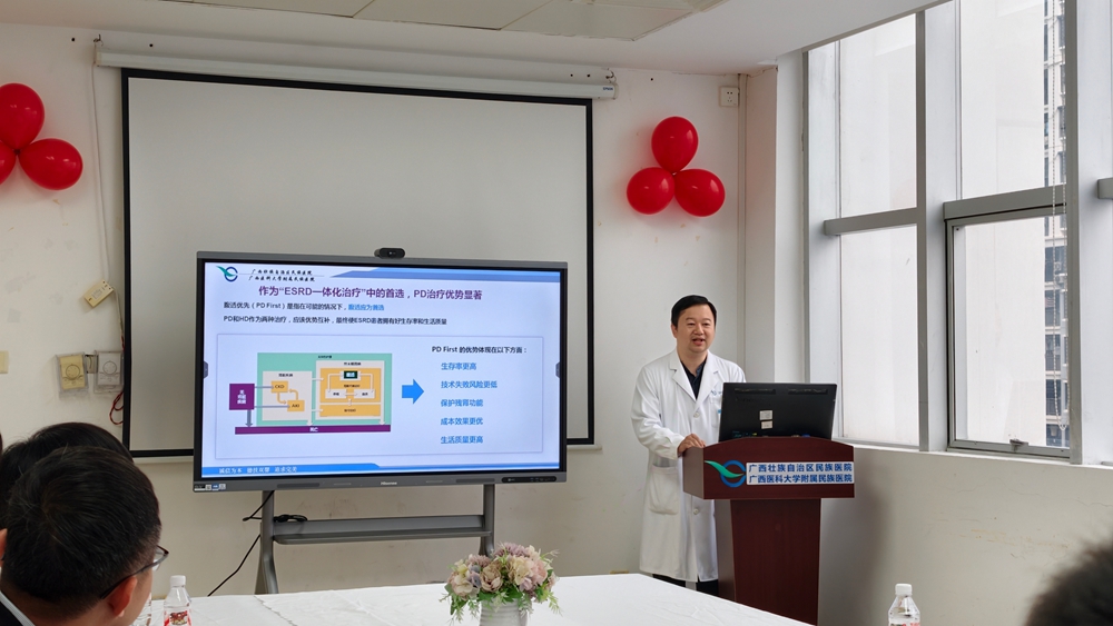 仪式尾声,肾内风湿免疫科蒙湛东副主任兼教学主任向各位领导详细介绍了慢病管理系统在腹膜透析患者管理中的核心优势。该系统可实时追踪患者诊疗数据、动态监测质控指标,为个性化治疗方案的调整与长期随访管理提供科学支撑,进一步保障居家透析的安全性与疗效。