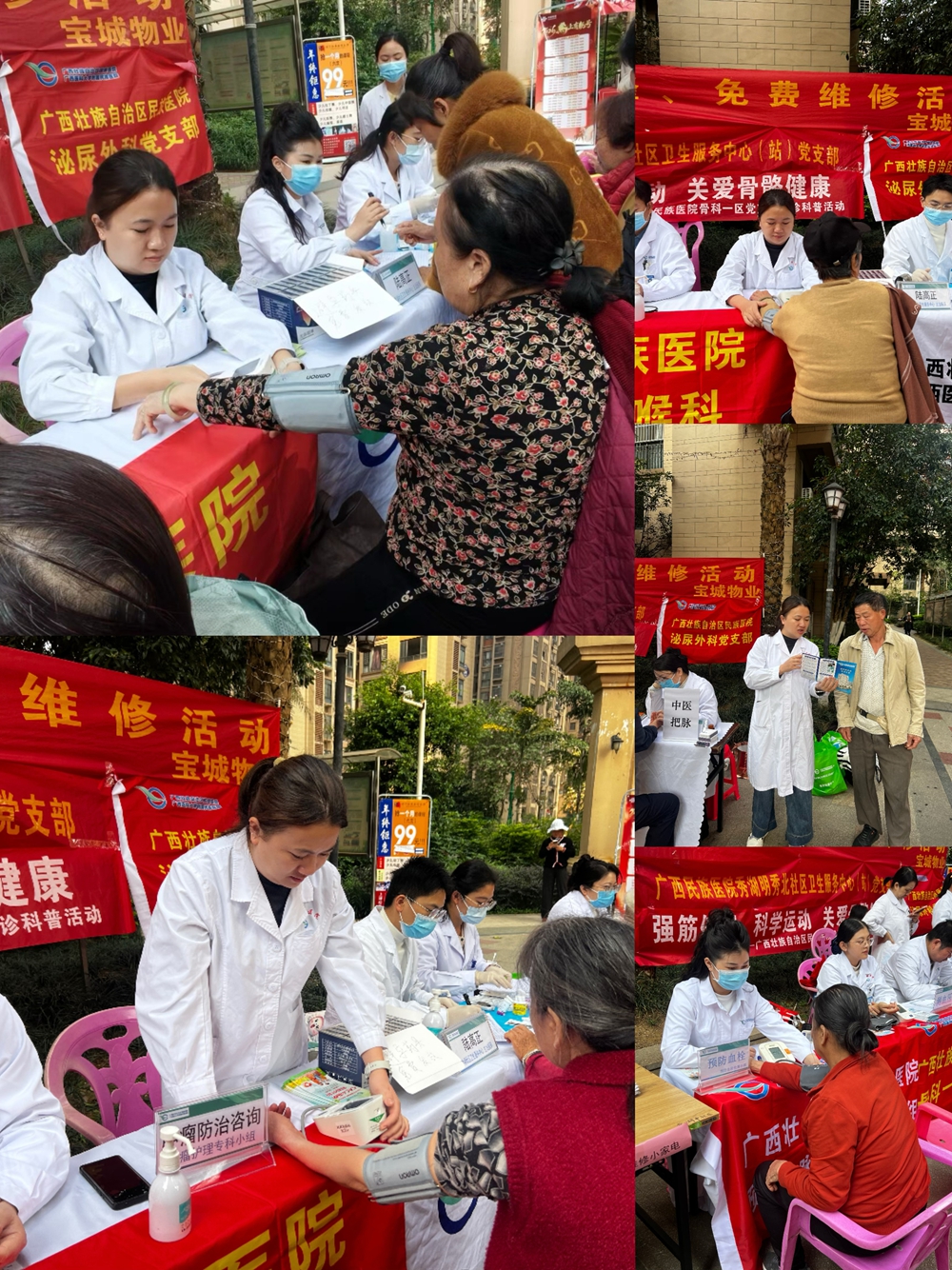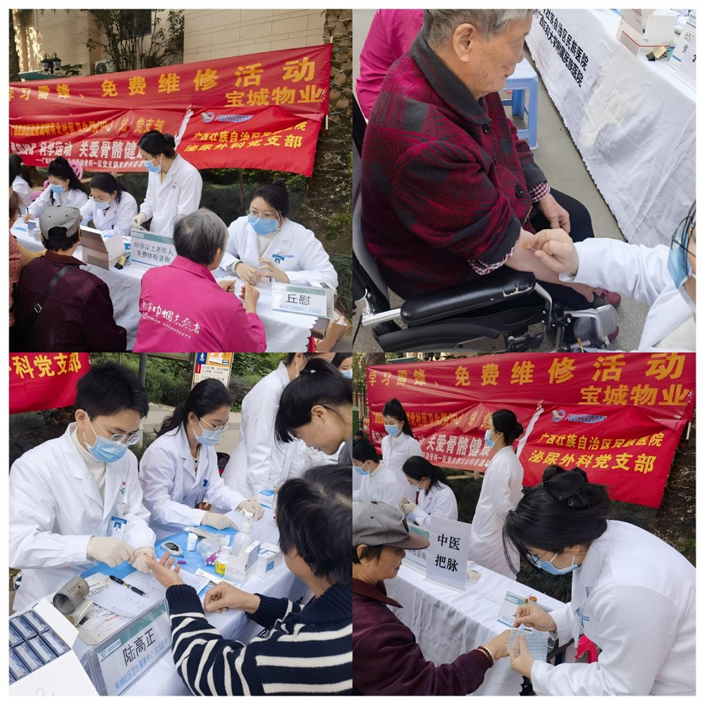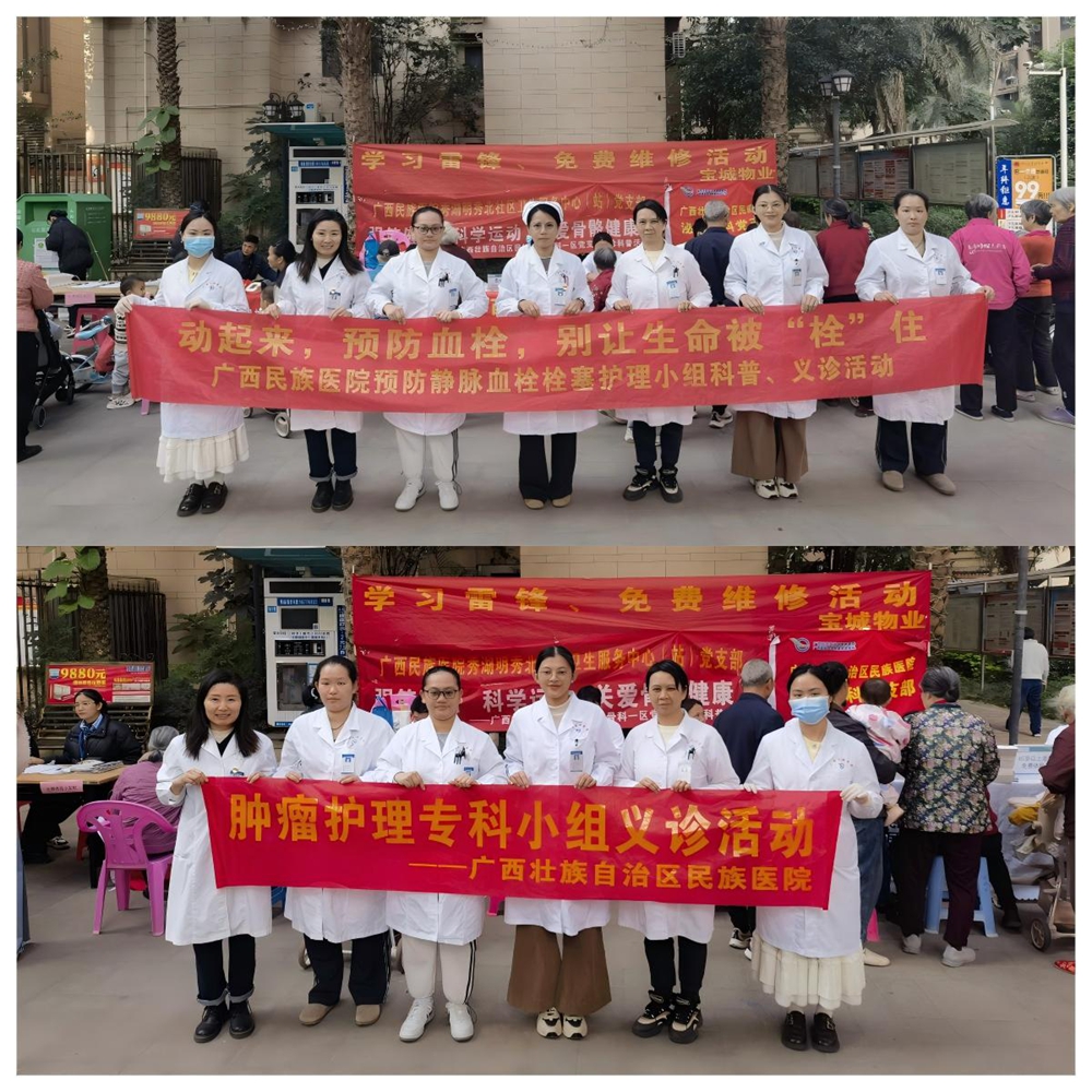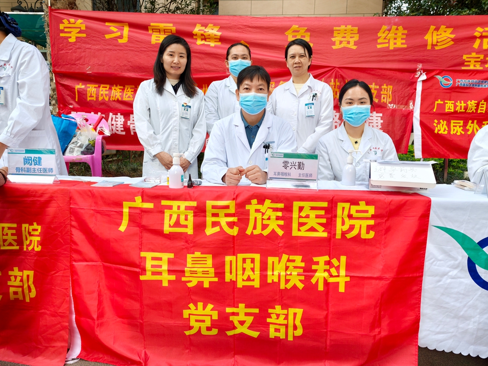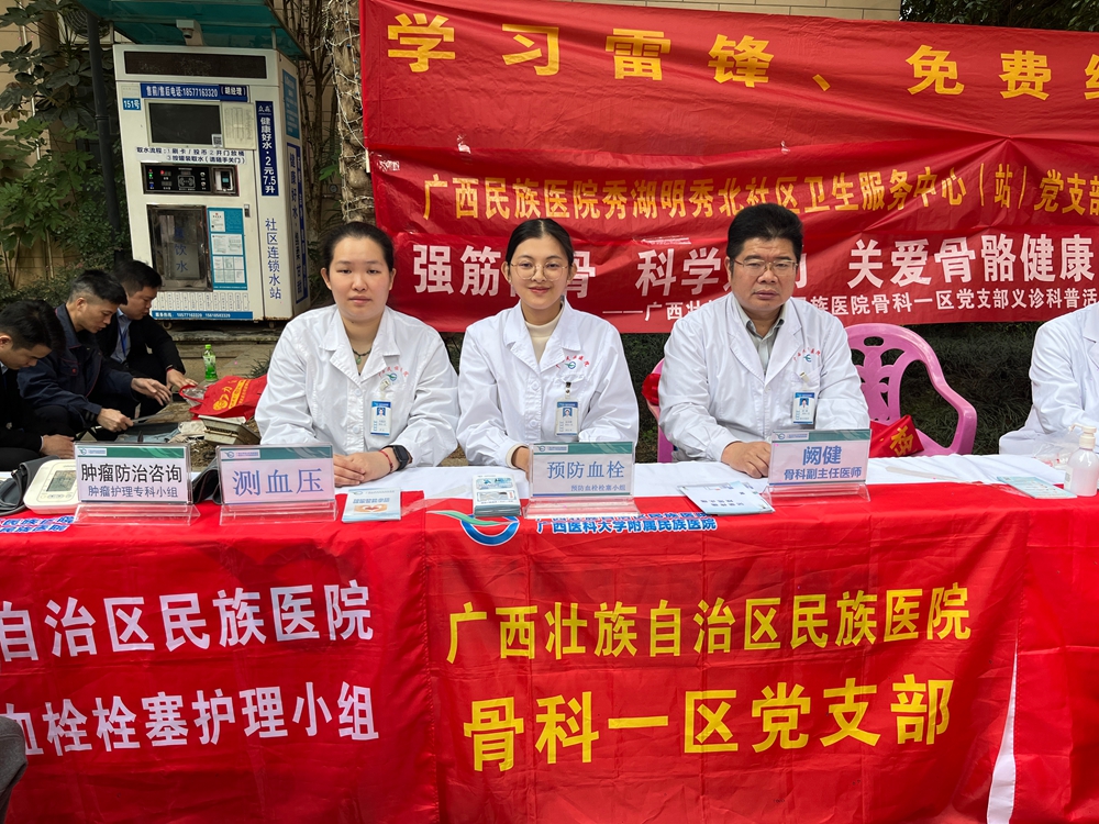 为深入学习贯彻习近平总书记关于弘扬雷锋精神的重要指示精神,扎实推进“我为群众办实事”实践活动,3月5日,我院社工部联合秀湖明秀北社区卫生服务中心党支部、骨科一区党支部、耳鼻喉科党支部、泌尿外科党支部、预防静脉血栓栓塞护理小组和肿瘤护理专科小组,走进西乡塘区昌泰尊府小区,开展“学习雷锋践初心 便民服务暖人心”主题志愿服务活动,将健康义诊与保健服务送到居民“家门口”。